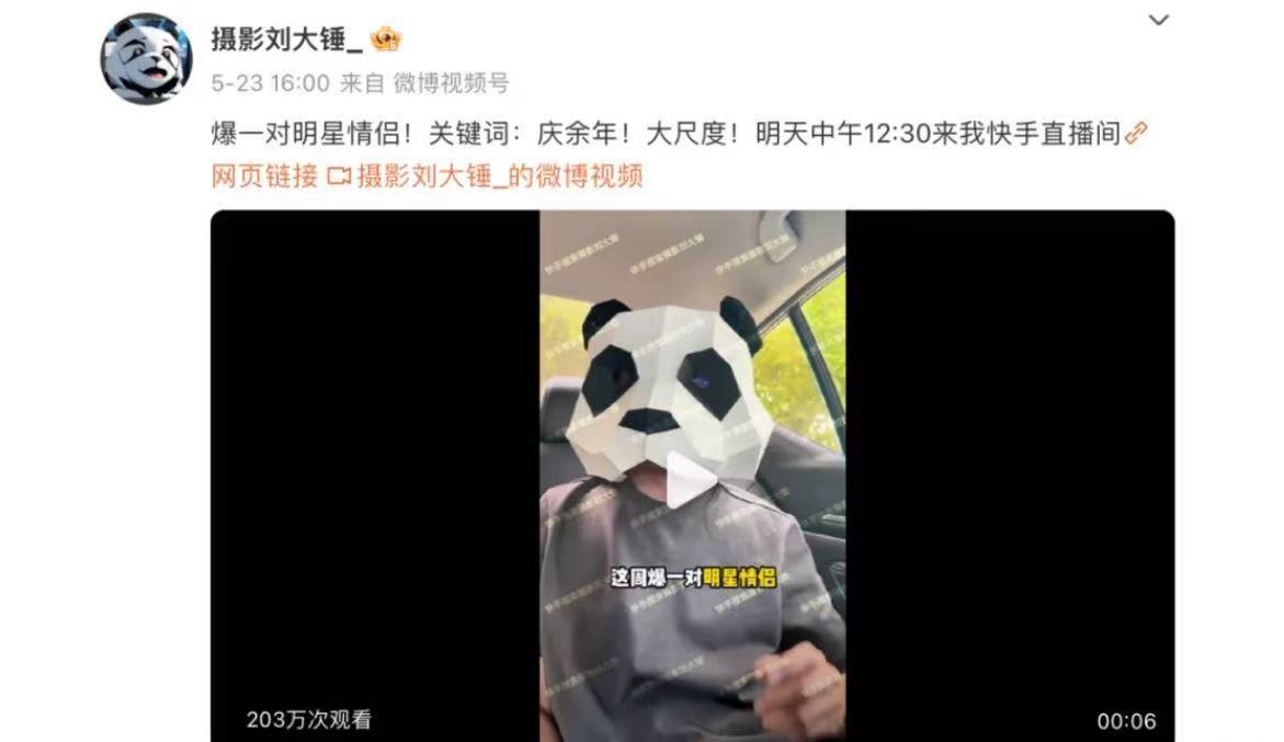 2024年5月,狗仔刘大锤在个人微博爆料“庆余年”、“大尺度”、“明星情侣”等关键词。