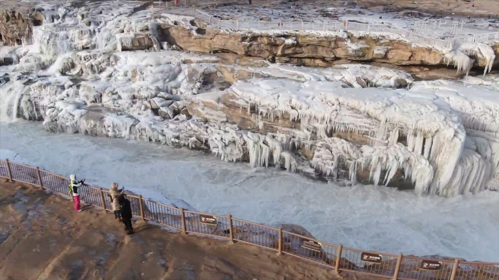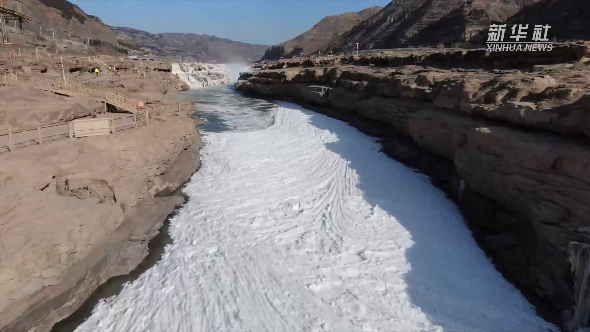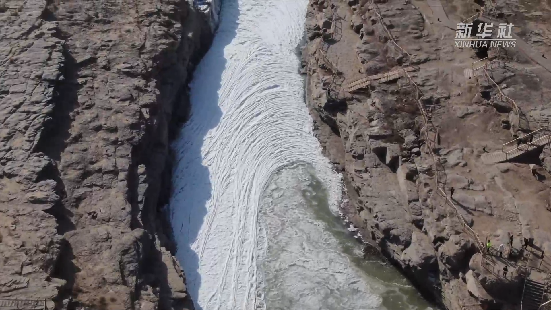 目前,黄河壶口段流凌封河的长度达到三公里。远远望去,宛若一条白色巨龙静卧在峡谷之中。